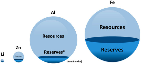 Relative availability of Li, Zn, Al, and Fe based on the estimated amount of “resources” and “reserves” in the Earth’s crust represented by the relative volume of the spheres (U.S. Geological Survey 2017) [59]. (*No clear calculations available; reserves for Al are considered to supply the worlds demand constantly—No definite estimations available for Si).