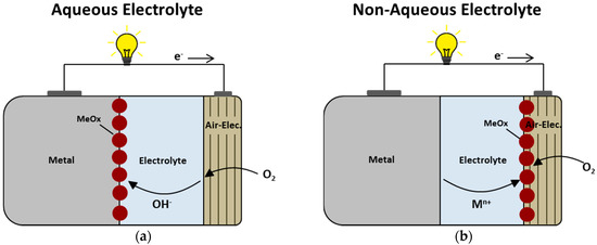 For MABs, from a theoretical point of view, the energy content of the cell is exclusively determined by the amount of available anode material, since the other electrode reactant, oxygen, is, ideally, drawn from ambient atmosphere [70]. Furthermore, it is assumed that the air electrode is infinitely thin, which is highly beneficial for the theoretical energy density of the battery, since the battery volume is not reduced by a second electrode material with considerable dimensions. However, the application of oxygen and particularly the application of oxygen from ambient atmosphere requires an at least partially open battery casing, which inflicts the risk for the electrolyte of drying or leaking out [71]. Moreover, the intrusion of CO2 and moisture may cause detrimental side reactions like the carbonation of alkaline electrolytes or the decomposition of the anode material due to reactions with water, which has to be resolved in order to prevent MABs from premature failure [36,37]. In this regard, especially the customized design of the air electrode by the application of appropriate membranes has proven to be effective, but still offers room for improvements [37]. Moreover, further challenges for MABs remain in the following issues, which will briefly be discussed depending on the applied type of electrolyte, i.e., aqueous or non-aqueous electrolyte.