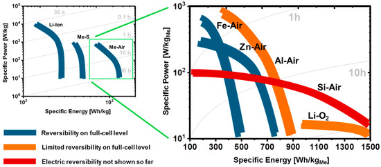 Considering the performance of MABs based on half-cell- and non-optimized full-cell experiments (since there are very few true full-cell results yet), it can already be established that Fe-air-, Zn-air-, Al-air-/Al-O2-, Si-air-, Li-air-/Li-O2-batteries may provide excellent specific energy as well as medium specific power on full-cell level in the future. Illustrating the potential performance of MABs in comparison to Li-ion- and metal-sulfur- (e.g., Li-S-) batteries, in the left panel of Figure 5 it is shown that state-of-the-art Li-ion batteries provide specific energies in a range from 200 to 300 Wh/kg and a maximum specific power of up to 10 kW/kg [25]. In contrast to that, sophisticated metal-sulfur batteries currently deliver specific energies of up to 500 Wh/kg and specific power of up to 1 kW/kg [91,92]. Furthermore, estimated values for the performance of potential MABs range from 500 to 1500 Wh/kgMe in terms of specific energy and from 0.1 to 1 kW/kgMe in terms of specific power [41,52,93,94].