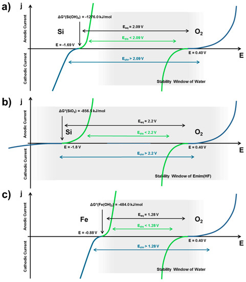 Polarization curves and cell chemistry of (a) aqueous Si-air-, (b) non-aqueous Si-air- (e.g., EMIm(HF)2.3F) and (c) aqueous Fe-air batteries. Grey areas indicate the stability window of the corresponding electrolyte, i.e., water or room temperature ionic liquid (RTIL), respectively. Green color indicates discharge conditions, blue color indicates charging conditions, black font indicates equilibrium conditions. (Adapted from [36]).