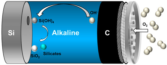 The basic structure of the primary Si-air cell is illustrated schematically in Figure 7. The cell is comprised of three main parts: A silicon wafer as anode, alkaline solution as electrolyte, and a carbon based air electrode as cathode. During the discharge of the cell, Si is oxidized at the anode producing four electrons and silicic acid (Si(OH)4) as reaction products (Equation (2)). Depending on the pH level of the alkaline electrolyte, silicic acid is then ionized to either SiO(OH)3− (pKa = 9.5) or SiO2(OH)22− (pKa = 12.5) [145,146]. In the presence of weak alkaline solutions (pH < 9) or neutral solutions, silicic acid would be converted into SiO2. Concomitant to the Si oxidation, diffused oxygen from the air is reduced by the catalysts at the cathode (Equation (4)). Subsequently, generated hydroxide ions migrate to the silicon anode and maintain the oxidation reaction. The electrochemical reactions upon discharge of a Si-air cell are described as [121,127,132]: