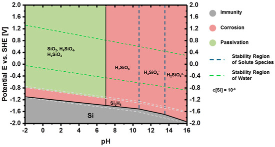 The thermodynamic stability of silicon in aqueous solutions and water is represented graphically by potential-pH diagrams (Pourbaix diagrams) [147,148]. According to Figure 8, silicon is not stable in water and aqueous solutions, since its immunity region remains far below the stability region of water. Thereby, in such solutions, silicon is prone to instant oxidation, while forming silica, silicates, or other products depending on the solution pH.