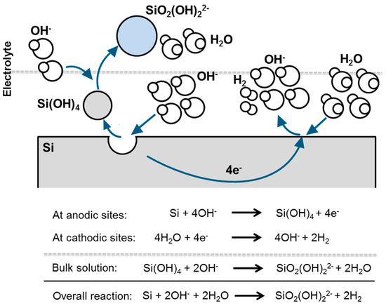 In general, most of the metals corrode via coupled electrochemical reactions. Figure 10 illustrates this behavior for a Si surface immersed in alkaline media. On the same silicon surface there is, on the one hand, a Si oxidation occurring at temporary anodic sites, on the other hand, concomitant water reduction takes place at temporary cathodic sites. During the oxidation reaction, Si dissolves and passes into solution as Si4+ (Si(OH)4). The produced electrons in this process are transported to cathodic sites where they are consumed by water reduction reaction. Overall, there is a material dissolution which is quantified by the anodic and cathodic reaction rates as well as by the electron flow between the different sites.