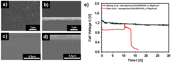 (a) Top-view of a Si surface after metal assisted chemical etching. (b) Cross-sectional view of a Si surface after metal assisted chemical etching (after Zhong et al.). (c) Top-view of an electrochemically modified Si surface in HF-based solutions. (d) Cross-sectional view of an electrochemically modified Si surface (after Park et al.). (e) Discharge profiles of Si-air cells employed with surface modified Si as anodes (after Zhong et al. and Park et al.). (Reprinted and adapted with permission from ACS Appl. Mater. Interfaces 7, 3126–3132, (2015). ©2015, American Chemical Society & ChemSusChem 5, 177–180, (2012). ©2015, Wiley & Sons) [127,128].