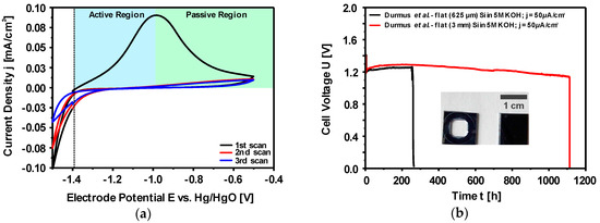 Up to this point, both studies reported the necessity of Si surface modification due to instant passivation of flat Si surface upon discharge. In a recent study this passivation phenomenon of polished (flat) Si wafer electrodes was investigated by Durmus et al. in cyclic voltammetry and galvanostatic discharge experiments [52]. The evidence of the surface passivation was obtained by cyclic voltammetry (CV) experiments, in which the highly As-doped <100> flat Si was cycled three times in 5M KOH. As depicted in Figure 13a, the cyclic voltammogram showed a single oxidation peak only in the 1st scan; following cycles did not provide any anodic oxidation current due to the passive surface. Further investigations on the polished Si wafers with potential limited CV experiments revealed two different regions as active and passive (Figure 13a). In the active region (up to the passivation peak potential), the rate of oxide formation on the Si surface is lower than its dissolution rate; hence, Si actively dissolves in the electrolyte. For potentials more anodic than the passivation peak potential, the oxide dissolution rate cannot keep up with its formation rate; consequently, the anodic current decreases due to complete coverage of the surface by oxide layer. According to the results of CV experiments, Si surface is expected to remain active as long as the anodic potential does not exceed the passivation peak potential. This was confirmed by 24 h galvanostatic discharge experiments of Si-air batteries (with flat Si anode) under 50 µA/cm2 current densities. Contrary to the previous reports, the Si-air batteries with flat Si electrode could be discharged not only in 5M KOH but even in 0.75M KOH electrolytes (lower dissolution of reaction products in diluted KOH solutions) at a stable cell voltage above 1 V. The recovery of the cell voltage back to OCV upon discharge termination is also a clear indication of oxide-free surfaces. In this regard, these results showed an agreement with those from Palik et al. who reported that anodic potentials could be applied on Si electrode without passivating the surface for 24–48 h [134].