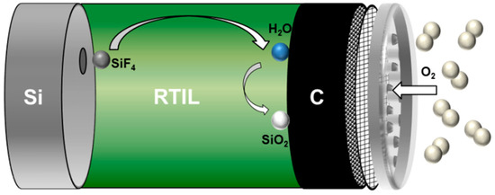 The basic configuration of the non-aqueous primary Si-air cell, which is similar to that of the aqueous system, is depicted in Figure 14. It is composed of three main parts: silicon wafer as anode, room temperature ionic liquid (RTIL) as electrolyte, and carbon-based air electrode as cathode. As Si suffers from severe corrosion reaction in conventional alkaline electrolyte, one of the possible approaches to overcome this problem is focusing on ionic liquid electrolytes. In this regard, the RTIL EMIm(HF)2.3F is a potentially promising candidate which can improve the performance of Si-air batteries. The discharge of the cell results in the oxidation of Si to Si4+ (SiF4) at the anode while O2 from ambient atmosphere is being reduced at the air cathode yielding H2O and trihydrogenated fluoride anions. At the electrolyte-air electrode interface, the SiF4 produced during the anodic oxidation further reacts with H2O to form SiO2 deposits as end products. The electrochemical reactions upon discharge of a Si-air cell are proposed as [53]: