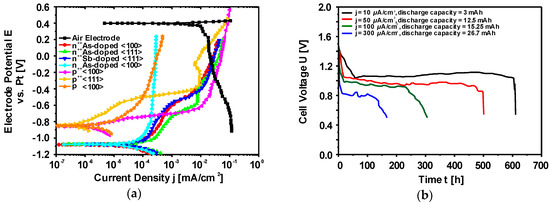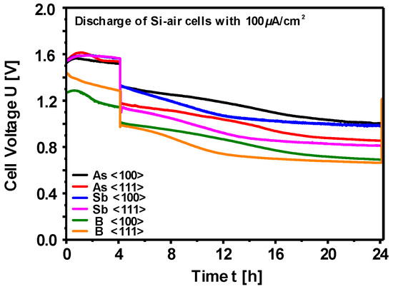 From the thermodynamical considerations, the half-cell potentials of anode and cathode are −1.69 V and 0.40 V vs. SHE, respectively. Thereby, the alkaline Si-air cell theoretically has a standard cell voltage of 2.09 V (considering a 4 electron process). In practice, however, the cell can only provide 1.50 V open circuit voltage (OCV) and be operated at voltages around 1.20 V under relatively low discharge current densities of 50 µA/cm2 [52,127].