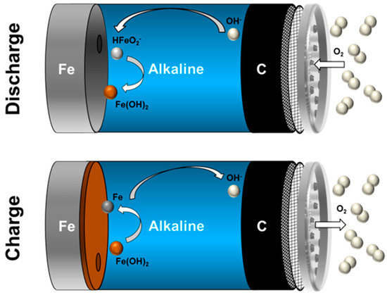 - Jackovitz, J.F.; Bayles, G.A. Iron Electrode Batteries. In Handbook of Batteries; Linden, D., Reddy, T.B., Eds.; McGraw-Hill: New York, NY, USA, 2002; ISBN 0071359788. pp. 720–746. [Google Scholar]