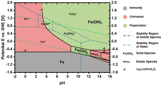 - Beverskog, B.; Puigdomenech, I. Revised Diagrams for Iron At 25–300 °C. Corros. Sci. 1996, 38, 2121–2135. [Google Scholar] [CrossRef]
