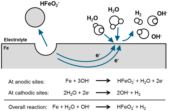 - Dražić, D.M.; Hao, C.S. The anodic dissolution process on active iron in alkaline solutions. Electrochim. Acta 1982, 27, 1409–1415. [Google Scholar] [CrossRef]