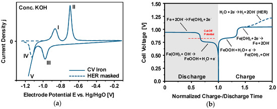 - Černý, J.; Micka, K. Voltammetric study of an iron electrode in alkaline electrolytes. J. Power Sour. 1989, 25, 111–122. [Google Scholar] [CrossRef]
