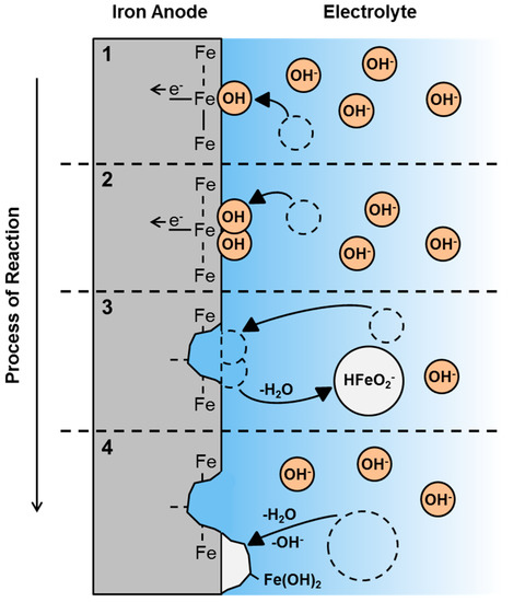- Andersson, B.; Öjefors, L. Slow Potentiodynamic Studies of Porous Alkaline Iron Electrodes. J. Electrochem. Soc. 1976, 123, 824–828. [Google Scholar] [CrossRef]