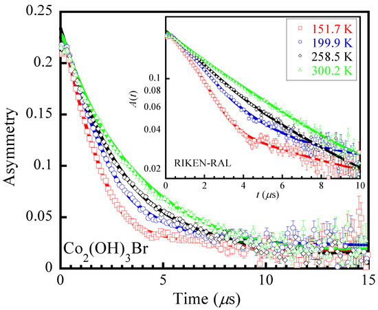 - Zheng, X.G.; Kubozono, H.; Nishiyama, K.; Higemoto, W.; Kawae, T.; Koda, A.; Xu, C.N. Coexistence of Long-Range Order and Spin Fluctuation in Geometrically Frustrated Clinoatacamite Cu2Cl(OH)3. Phys. Rev. Lett. 2005, 95, 057201. [Google Scholar] [CrossRef] [PubMed]