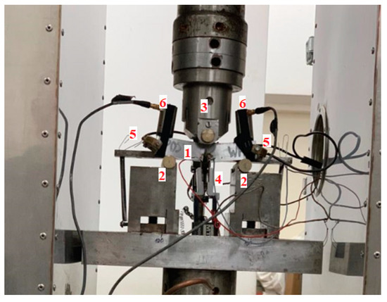 Figure 1. The view of the SENB specimen with AE sensors (Zwick-100, ZwickRoel Ulm, Germany) during test: 1—a sample, 2—support, 3—load cylinder, 4—COD extensometer, 5—AE sensors—100–1200 kHz, 6—AE sensors—30–80 kHz.