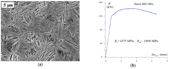 For determining material strength characteristics, cylindrical specimens 10 mm in diameter were prepared with the measuring section of 50 mm. For determining the critical value of fracture toughness, KIC, the specimens with dimensions 12.5 mm × 25 mm × 110 mm with one-sided notch and crack fatigue (SENB) with a total length of about 12.5 mm were made. Figure 2b shows an example plot of loading a cylindrical specimen. On the basis of the graphs, strength characteristics of 40CrMo steel were determined: Re = σy = 1475 MPa; Rm = σuts = 1800 MPa; E = 205 GPa. During the loading of the SENB specimen, it was determined that the crack growth process takes place according to the brittle fracture mechanism. All standard conditions were met. The obtained critical value of fracture toughness is a material characteristic and is equal to KIC = 39 MPa∙m1/2.
