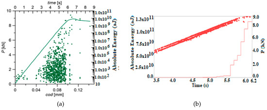 Five specimens were tested. The load plots and the character of AE signals distribution were similar in all tested samples. Figure 3b shows the characteristic loading curve and numerous points of the absolute energy of AE signal and the graph illustrating the cumulative absolute energy vs. load on time from 3.5 to 6.2 s. The graphs show AE parameters without using the clustering method (identification) of destructive processes.