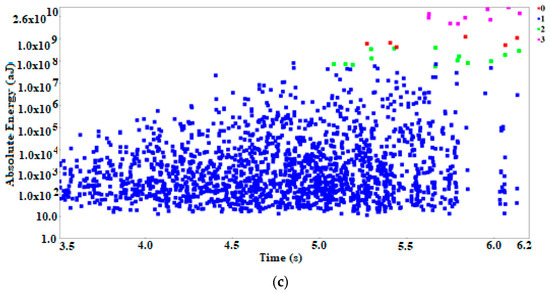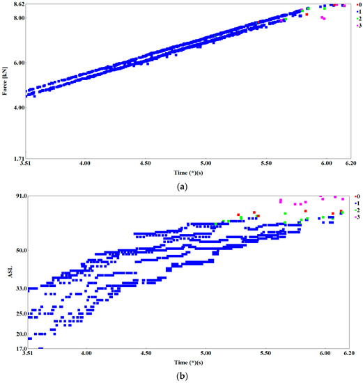 Figure 5. Scatterplots of acoustic emission signals: (a) Force (kN) vs. time (s); (b) ASL (dB) vs. time (s); and (c) absolute energy (a) vs. time (s).