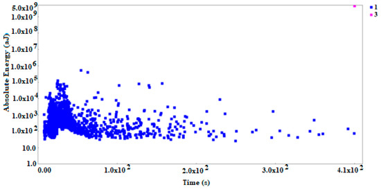 Figure 6. Scatterplot: Absolute energy (aJ) vs. time (s) for uniaxial tested specimen.