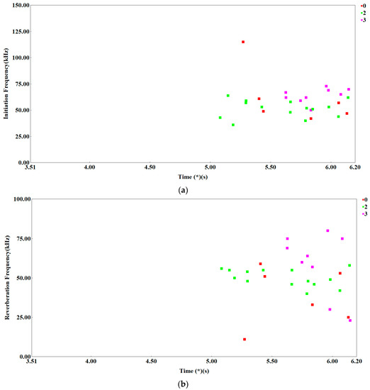 Figure 7a,b presents the parameters of the acoustic emission signal: initiation frequency (IF) (kHz) and reverberation frequency (RF) (kHz) vs. time and signal classes. Analysing these graphs, it can be seen that green signals have a similar frequency range in the initial stage (IF) parameter as well as in the later stage (RF) parameter during signal duration. This range falls within the frequency range of pink signals.