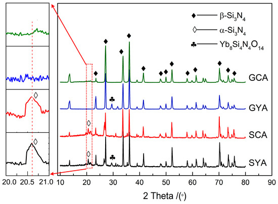 The effect of sintering additive combinations and sintering techniques on the relative density of the sintered samples is shown in Table 2. Irrespective of the sintering additives, the density of SPS sintered samples was greater than that of GPS sintered samples, mainly because the higher pressure of 50 MPa was applied in SPS sintering, which promoted densification [18]. Under the same sintering technique, the relative density of CA was slightly higher than that of YA because CeO2 can form a eutectic liquid phase (CeO2–SiO2/CeO2–SiO2–Si3N4) at lower temperatures than Yb2O3 [19,20]. With the rise of temperature to respective sintering temperatures, the viscosity of the eutectic liquid phase further reduced, which effectively enhanced the rearrangement of silicon nitride granules and promoted densification.