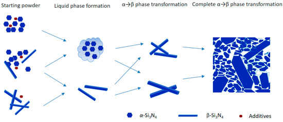 The schematic sequence of Si3N4 crystal phase transition is shown in Figure 2. With the formation of the liquid phase by the reaction of sintering additives with SiO2 on the surface of Si3N4 and partly Si3N4 itself, the α-Si3N4, being an unstable phase, dissolved in the liquid phase and re-precipitated in the form of elongated β-Si3N4 needles. The initial β-phase seeds provide nucleation sites or promote the re-precipitation process. The aspect ratio of newly produced or re-precipitated β-phase depends on the sintering parameters, sintering additives, the viscosity of liquid phase, etc.