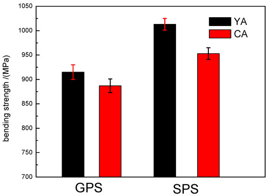 The bending strength of samples sintered with the YA additive was greater than that with CA in both GPS and SPS sintering. According to the calculation method proposed by Tseng shown in Equation (3) [23], the bending strength depends on the average length-to-diameter ratio, called the aspect ratio (AR), of β-Si3N4 grains. It can be observed from Figure 3a,c that the aspect ratio of β-Si3N4 grains with the YA additive combination was higher than that with CA, indicating that YA is more useful to promote the bending strength than CA.