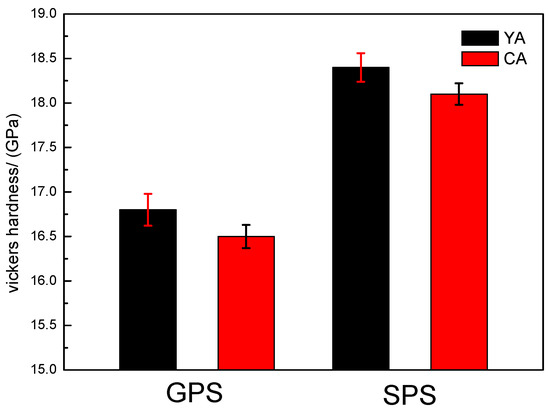 Similarly, the fracture toughness of samples with the YA additive was greater than that with CA in SPS and GPS sintering, indicating that the YA system can promote fracture toughness more than the CA system.