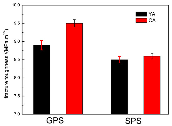 The fracture toughness of GPS and SPS sintered samples with YA and CA additive combinations is shown in Figure 6.