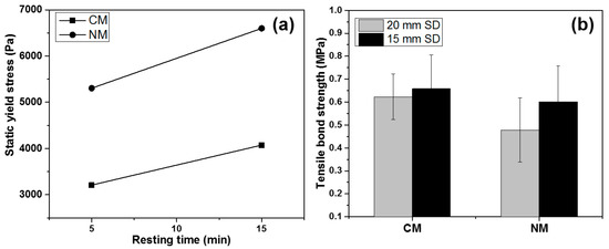 - Reducing the standoff distance below the nozzle opening size (width) had a positive impact on improving the bond strength of the NM mix, which can be explained by the decreased porosity in the interface zone. The impact of the nozzle standoff distance was found to be more pronounced for the material with a higher yield stress value.