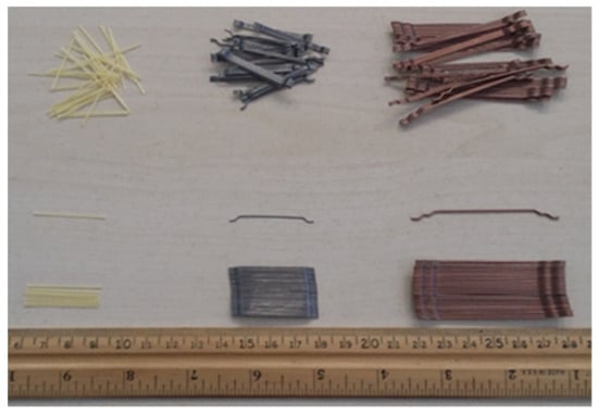 Cement-based materials are weak materials in term of tensile strength, and thus concrete has a brittle behavior and cracks are practically unavoidable [,]. Cracks are created in different scales once the applied load exceeds the concrete’s tensile strength [,]. Additionally, the shrinkage of concrete can cause cracking in early stages and subsequently shortening of the serviceability of the concrete structure as a result of exposure to harmful substances []. The introduction of discrete fibers is accepted as a favorable solution in the manufacturing of composites with increased mechanical characteristics, because it controls the propagation of cracks [,,,,]. Moreover, fibers can decrease drying shrinkage deformation either by improving cohesion between the concrete matrix and fibers, which contributes to physically restraining shrinkage [], or controlling cracks (the most important effect of fibers in the shrinkage of concrete []). Nonetheless, the efficiency of fibers in concrete vary, depending on important factors such as fiber type, elastic modulus of the fiber, and fiber aspect ratio [].