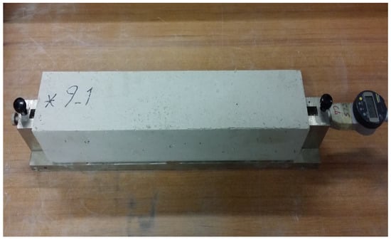 Compressive strength tests were conducted on the cubic specimens with 100 mm dimension as per ASTM C39 []. The splitting tensile strength tests were carried out in accordance with ASTM C496 [] by using cylindrical specimens with dimension of 100 mm × 200 mm. The elastic modulus of concrete specimens was assessed by using cylindrical specimens with diameter of 100 mm and height of 200 mm as per ASTM C469 []. The flexural performance of concrete was evaluated by using 150 mm × 150 mm × 600 mm beams in accordance with BS EN 14651 []. Dimensional stability under a drying condition was measured on 100 mm × 100 mm × 500 mm prismatic beams. The length change measurements were started after demolding of the specimens and continued at the ages of 1, 2, 3, 7, 14, 28, and 56 days. Dimensional stability was conducted on the specimens stored in a room with 50% RH level and temperature of 23 °C. The test set up for measuring the shrinkage of specimens is shown in Figure 2. The microstructure of concrete was studied in the secondary electron (SE) mode by means of the SEM method. A VEGA-II TESCAN microscope (TESCAN, Brno, Czech Republic) was used to explore the morphology of the concrete specimens. Carbon coating was used to avoid the charging problem.