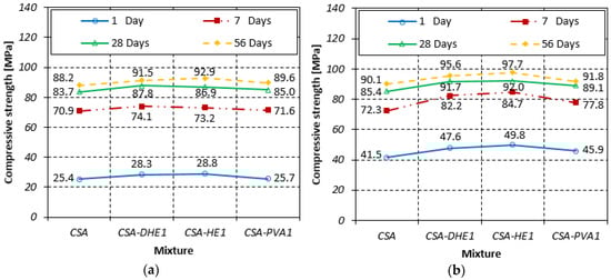 The main constituent of CSA clinker is ye’elimite (C4A3$), and depending on the raw material composition, it may contain minor phases like belite (C2S), calcium sulfate (C$), and aluminoferrite (C4AF) [,,]. The increase in the content of ye’elimite in the CSA clinker leads to a higher strength in the early ages, while a raise in the belite content results in an increase in strength at a later age. In general, raising the content of calcium sulfate results in a lower strength of the concrete [], while its presence speeds up the hydration process of CSA cement []. Hence, it is expected to attain higher strength at early ages by the addition of calcium sulfate to the CSA cement. However, it should be noted that the addition of more than 25% calcium sulfate can cause reduced strength due to cracking of the cement matrix. Dimensional stability features of CSA cement are significantly influenced by the variation of the gypsum and anhydrite content that were added to the raw mix []. The presence of gypsum (CaSO4) content between 18–20%, 22–24%, and higher than 25% resulted in slight shrinkage during setting, minimal dimensional change, and notable expansion, respectively [].