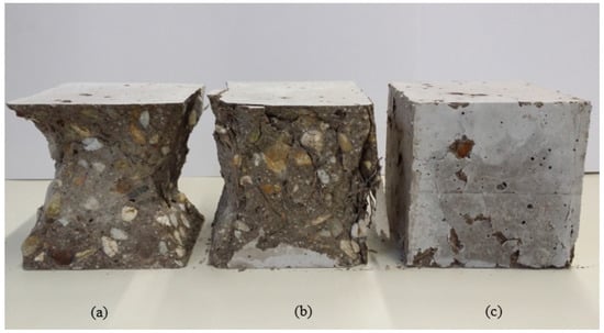 Failure mode of high performance concrete under compression load: (a) 0% fiber, (b) 1% DHE steel fiber, (c) 1% PVA fiber.