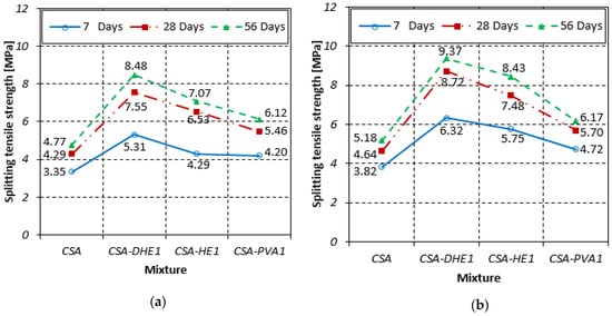 For FRC developed at a water-cement ratio of 0.28, a similar trend to concretes with a water-cement ratio of 0.35 was observed. The addition of fibers in concrete caused an improvement in splitting tensile strength, irrespective of the type of fibers. As can be seen in Figure 5, the highest splitting tensile strength was attained once 1% DHE steel fibers was employed. For instance, the splitting tensile strength of this mix increased by 65%, 88%, and 81% at 7, 28, and 56 days, respectively, over that of the plain CSA concrete. It was observed that the increase in the splitting tensile strength of CSA-HE1 mix ranged from 51% to 63%, while this increase for the CSA-PVA1 mix varied from 19% to 24%, as compared to those of the CSA mix, depending on the testing age. The coefficient of variation of splitting tensile strength test results varied between 3.3% and 7.4%, depending on the water-cement ratio, fiber content, and testing age.