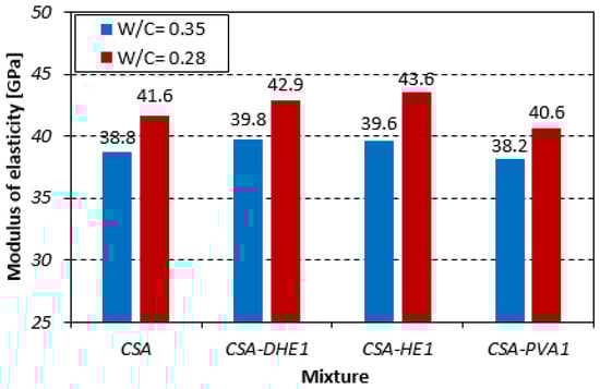 The 28-day modulus of elasticity of different FRC mixes with water-cement ratios of 0.35 and 0.28 is shown in Figure 6. The results reveal that the inclusion of metallic fibers resulted in a negligible increase in the elastic modulus of concrete, while introducing PVA fibers in concrete slightly reduced its modulus of elasticity. The improved modulus of elasticity of concretes with steel fibers can be attributed to the influence of steel fibers on the stiffness of the composite. The coefficient of variation of modulus of elasticity test results varied between 1.9% and 4.8%, depending on the water-cement ratio, fiber content, and testing age. The influence of fiber types on the modulus of elasticity of self-compacting concrete was investigated by Beigi et al. []. It was revealed that the introduction of fibers had an insignificant impact on the elastic modulus of concrete. Their results showed that the modulus of elasticity of FRC was reduced slightly in some cases, when compared to that of the reference concrete. This is in good agreement with the results obtained in the current study.