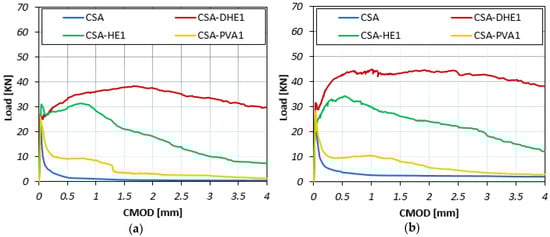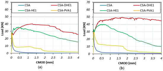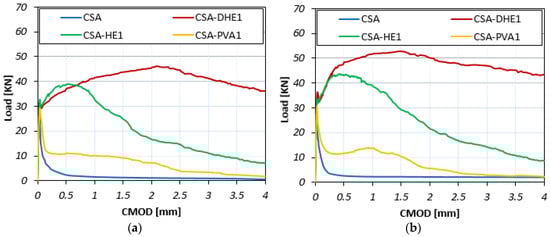 The Load-CMOD curves for different fiber-reinforced concretes at curing ages of 7, 28, and 56 days are illustrated in Figure 7, Figure 8 and Figure 9. The results reveal that the inclusion of fibers led to an increment in the maximum flexural load of concrete at all curing ages irrespective to the fiber type. For example, the flexural strength improvement of CSA-DHE1, CSA-HE1, and CSA-PVA1 mixes ranged from 55% to 73%, 37% to 42%, and 7% to 15%, respectively, depending on the age of testing. As can be noticed, the concretes containing 1% DHE steel fibers exhibited the highest flexural strength compared to other FRC considered in this study. The anchoring mechanism, high tensile strength, and high modulus of elasticity of DHE steel fibers are the main factors that importantly contribute to the improved flexural strength of CSA-DHE1 mix. Simões et al. [] demonstrated that concrete samples were reinforced with DHE steel fibers achieved significantly higher peak load in fiber pull-out test as compared to the conventional steel FRC, and because of that the flexural strength of concrete can be substantially improved. The results further indicate that the Load-CMOD behavior of concretes is significantly different, depending on the fiber type used. As can be observed in Figure 7, Figure 8 and Figure 9, introducing 1% DHE steel fibers in CSA concrete resulted in a deflection-hardening behavior in concrete, while concretes reinforced with 1% HE steel fibers exhibited a deflection-softening performance. The results also demonstrate that the CMOD matching the maximum flexural load varied from 1.26 mm to 2.11 mm for the CSA-DHE1 mix, while this varied from 0.39 mm to 0.72 mm for the CSA-HE1 mix, depending on the testing age. This can be attributed to the capacity of DHE steel fibers to restrain the wide spreading of macro-cracks in concrete as a result of its higher length, tensile strength, and anchoring mechanism. On the contrary, HE steel fibers due to their lower tensile strength and length improved the flexural load carrying capacity of concrete beyond the appearance of the first crack, up to CMOD equal to 0.72, and caused a deflection-softening behavior due to extensive cracks creation. Moreover, the results show that the inclusion of PVA fibers in concrete slightly increased the flexural load and after the appearance of the first crack, PVA fibers were not able to connect the macro-cracks and prevent further crack propagation. As a consequence, the flexural load significantly reduced and an almost flat behavior in load carrying capacity of the CSA-PVA1 mix was seen.