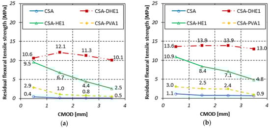 Similarly, the results of concrete prepared at a water-cement ratio of 0.28 indicate that the residual flexural tensile strengths of concrete containing 1% DHE steel fibers were significantly higher with respect to those of the concretes reinforced with 1% HE steel or PVA fibers, particularly at greater CMOD. For instance, the Fr3 of CSA-DHE1, CSA-HE1, and CSA-PVA1 mixes at 28 days were 15.4, 6.4, and 1.2 MPa, respectively. As can be noticed in Figure 10, Figure 11 and Figure 12, CSA-DHE1 were the only specimens at both water-cement ratios that show a deflection-hardening response and Fr3 and Fr4 were slightly lower than Fr2. This can be explained by the fact that the DHE steel fibers bridge the macro-cracks and absorb more energy as the flexural load exceeding the strength of concrete and its anchoring mechanism have an important influence on the improvement of flexural strength [].