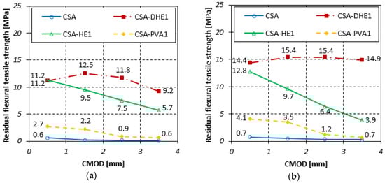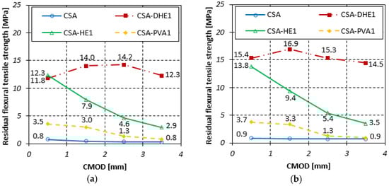 Residual flexural tensile strength of different fiber-reinforced concretes cured for 28 days at water-cement ratios of: (a) 0.35, (b) 0.28.