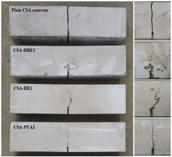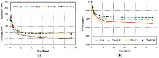 The results further indicate that contrary to concretes manufactured at a higher water-cement ratio (i.e., 0.35), no evidence of expansion occurred in CSA-based mixes at a water-cement ratio of 0.28. In other words, the expansion of concrete at day 1 has been fully canceled and a greater amount of shrinkage took place in the early periods as compared to concretes with a water-cement ratio of 0.35. This can be explained by the appearance of autogenous shrinkage that occurred in these concretes as a result of higher cement content and lower water-cement ratio. However, the shrinkage strain of concretes at later periods (i.e., 56 days) was lower as compared to concrete with a higher water-cement ratio. Cheung and Leung [] studied the autogenous and drying shrinkage of concrete produced at different water-binder ratios of 0.19, 0.3, and 0.4. They reported that the autogenous shrinkage represented a significant proportion of the total shrinkage in the concrete with a water-binder ratio of 0.19, whereas this was highly reduced in concretes with higher water-binder ratios of 0.3 and 0.4. The results of fiber-reinforced concretes show that the addition of discrete fibers caused a reduction in shrinkage strain. As can be seen in Figure 15, the lowest shrinkage deformation was developed by the mix containing 1% PVA fibers—it was reduced by 27% as compared to that of the plain CSA mix. This was followed by the CSA-DHE1 and CSA-HE1 mixes that attained a shrinkage strain of 209 µm/m and 249 µm/m, respectively, while the shrinkage of reference CSA mix was 252 µm/m. The findings of this study are in close agreement with previous studies that reported that fibers can control shrinkage cracking [,].