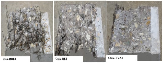It should be noted that the orientation of fibers and their distribution in the concrete beams have an important effect on the flexural performance of concrete. The cross sections of fracture concrete beams containing different types of fibers and the distribution of fibers on their surface are shown in Figure 14. As can be seen, DHE steel fibers were dispersed uniformly in the cross section of concrete and majority of the fibers were aligned perpendicular to the fracture surface. This can result in a good flexural performance, as already shown in the Load-CMOD curves. Figure 14 further shows that the HE steel fibers were not dispersed uniformly at the cross section of the concrete beams, and some area remained uncovered with the fibers. This may result in the variation of flexural behavior and adversely affect the post-cracking behavior of the specimens. The fractured surface of CSA-PVA1 mix shows that the PVA fibers were ruptured or debonded from the cement matrix. As PVA fibers are straight and have lower length and tensile strength with respect to those of the metallic fibers, they are not able to significantly increase the flexural strength of concrete and cause an improvement in the flexural toughness of concrete.