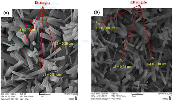 SEM observation was performed in the secondary electron (SE) mode to study the microstructure of concrete; the images are shown in Figure 16, which shows the formation a rich amount of ettringite in CSA cement-based concretes at both water-cement ratios as a result of ye’elimite hydration. The results reveal that the size of prismatic ettringite crystals in the CSA mix with a water-cement ratio of 0.35 ranged from 0.29–0.7 µm wide with 2–6 µm length. The presence of a high amount of prismatic ettringite crystals in CSA concrete can be responsible for its higher mechanical properties strength and also lead to dimension stability of concrete [,]. The results further indicate that the size of ettringite crystals was reduced by decreasing the water-cement ratio. In concrete with a lower water-cement ratio, the size of prismatic ettringite crystals varied between 0.1–0.5 µm wide, and 2–6 µm length.