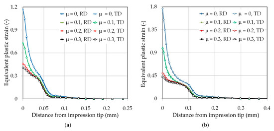 Figure 12 shows the distribution of the equivalent plastic strain in the area of impression along the RD and TD under loading. A clear effect of the friction conditions on the value of equivalent plastic strain can be revealed, especially at the tip of the impression. An increase in the coefficient of friction causes a limitation of the material flow from the tip of the indenter into the impression edge zone. As a consequence, the distribution of equivalent plastic strains predicted at friction was characterized by a more flat shape. The effect of the friction coefficient value on the value of equivalent plastic strain in the area of impression tip was distinct. The difference between the values of equivalent plastic strain measured at RD and TD increased with increasing distance from the impression tip and reached 8%–19% depending on friction conditions and indenter displacement.