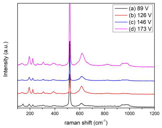 In order to study the effect of substrate biasing, we have used single-phase VO2 thin films deposited under different substrate bias voltages. This is because nonstoichiometric VOx thin films usually have significantly different properties compared with single-phase VO2 and therefore cannot be used in this work. In our previous work, Raman spectroscopy results have shown to be very useful in studying the stoichiometry of VO2 thin films [26]. Therefore, Raman measurements were again used in this study. The deposition conditions are listed in Table 1. Figure 1 shows the Raman spectra of the as-deposited VO2 thin films. All the films show typical VO2 with the bias voltage ranging from 89 V to 173 V, suggesting that the films have good stoichiometry [26]. The sharp Raman peak at 520 cm−1 and the broad peak at around 950 cm−1 are from the vibrations of the Si substrate [27].