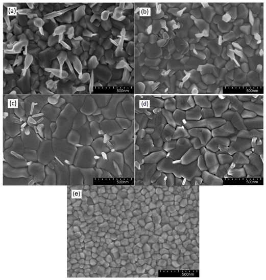 SEM images of VO2 thin films deposited on Si substrates for 2 h with bias voltage of: (a) 89 V; (b) 126 V; (c) 146 V; (d) 173 V; (e) no bias on a sample prepared as in [23].