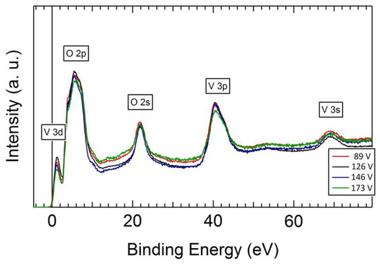 To fully understand the chemical states near the surface area, we have also taken x-ray photoemission spectroscopy on our as-deposited VO2 thin films as shown in Figure 3. The measurement was performed at PGM beamline at the Canadian Light Source, with a beam size of 200 × 200 μm2 at room temperature. We can compare the electron states of V 3d and 3p and O 2s in the films deposited under different biasing voltage in Figure 3. It should be mentioned that due to the sensitivity of this technique and the short escape depth of the electrons, the electrons accounting for the spectra are coming from the very surface, at a depth of a few Angstroms from the surface. Therefore, the spectra give information on how the V–V and V–O bonds can be distinguished from each other on the surface. Based on the XPS spectra shown in Figure 3, with all the electronic states considered, it can be concluded that the substrate biasing voltage has little influence on the V–O and V–V bonds at the surface of the thin films.