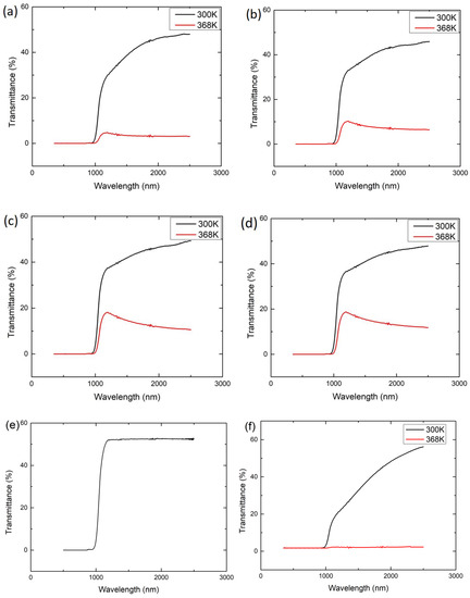 Optical transmittance of the as-deposited VO2 thin films with a substrate bias voltage of: (a) 89 V; (b) 126 V; (c) 146 V; (d) 173 V; (e) bare Si substrate; (f) no bias (data extracted from reference [23] and replotted).