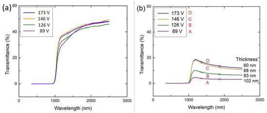 The transmission spectra of the as-deposited VO2 thin films under different biasing conditions are shown in Figure 4. It should be noted that at wavelengths less than 1100 nm (corresponding to the 1.1 eV bandgap of Si), the Si substrate absorbs all the light as shown in Figure 4e, so there is no transmittance. The maximum transmittance reaches about 50% at a wavelength of 2500 nm. The optical transmittance of VO2 thin films deposited under different bias voltage at (a) 300 K and (b) 368 K are shown in Figure 5. While in the insulating phase (at 300 K), the transmittance values are very close, in the metal phase (at 368 K), there is distinct dependence on the bias voltage during deposition. However, the actual effect arises from the difference in the thicknesses. The optical transmittance of a homogeneous medium generally decreases with increasing film thickness as T = T0exp(−αL), where α is the attenuation coefficient, L is the film thickness, and the term T0 is a pre-exponential constant (T as L → 0). Figure 6 shows the semilogarithmic plots of the optical transmittance (T as %) vs the film thickness in the insulating and metal phases. The transmittance contrast ΔT (transmittance difference between normal and switched states) vs film thickness is also shown. First, consider the metal phase at 368 K, and notice the clear reduction in the transmittance as the film thickness increases, following an exponential behavior with an attenuation coefficient α ≈ 3.1 × 107 m−1 at a wavelength of 2000 nm. The reason we can deduce an attenuation coefficient from the ln(T) vs L plot is that the light intensity is extinguished so much as it passes through the film in this metallic phase that interference phenomena arising from Fresnel reflections are insignificant. This is not the case in the insulating phase.