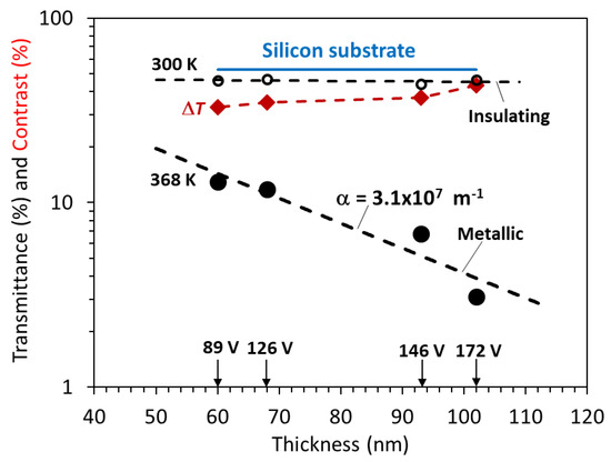 The transmittance contrast ΔT, an important metric for device applications, increases with film thickness because of the steep decline in the transmission through the metal state.