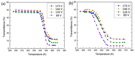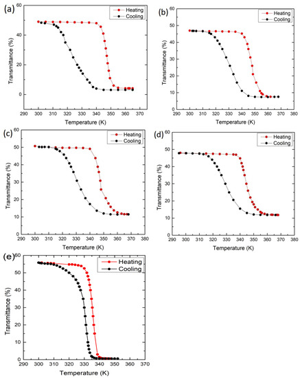 Optical transmittance of the as-deposited VO2 thin films under heating (red) and cooling (black): (a) 89 V; (b) 126 V; (c) 146 V; (d) 173 V; (e) no bias (data extracted from reference [23] and replotted).