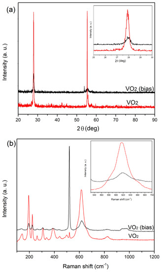 (a) X-ray diffraction patterns and (b) Raman spectra of VO2 thin films (red) and VO2 thin films deposited with 173 V bias (black).